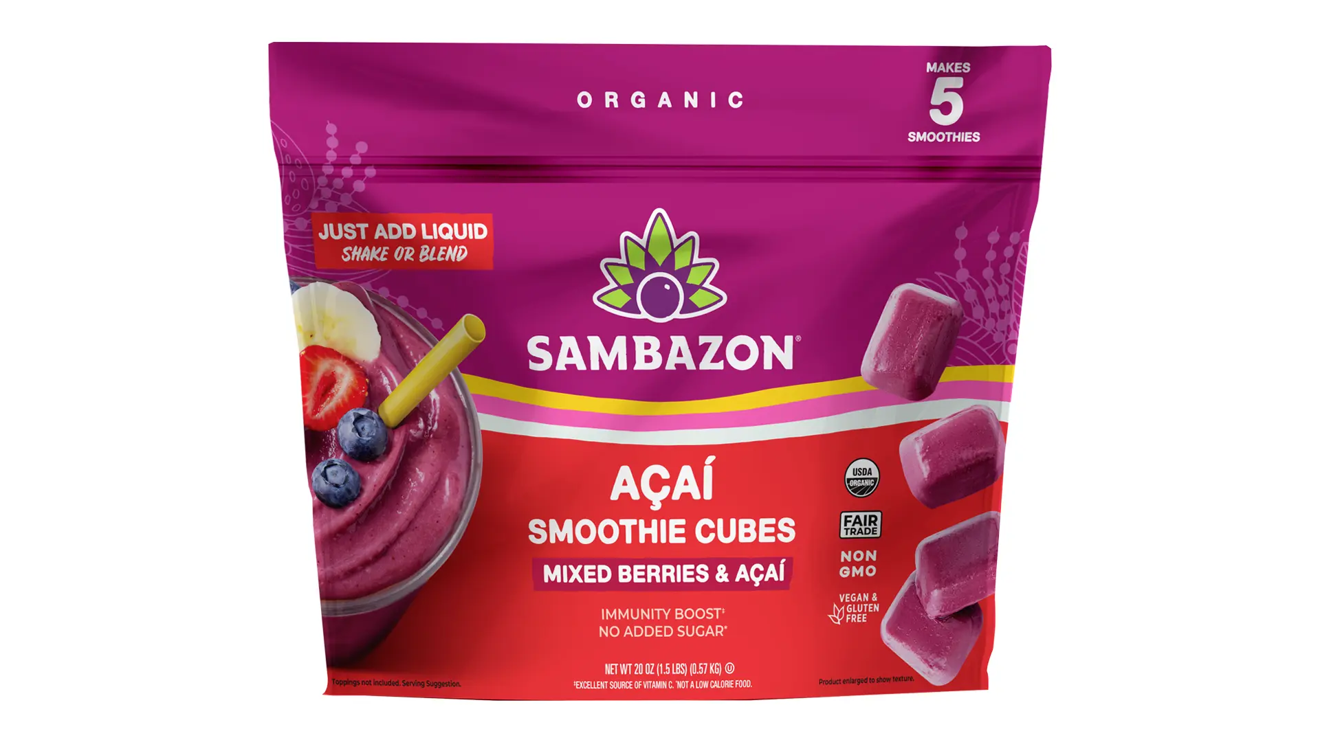 Organic Açaí Smoothie Cubes are crafted for convenience, taste, and nutrition. A blend of exotic Açaí and Mixed Berries make a refreshing smoothie recipe with immunity support from Antioxidant Vitamin A. Plus, SAMBAZON's Açaí is Fair Trade, organically-grown, ethically sourced, and always delicious.